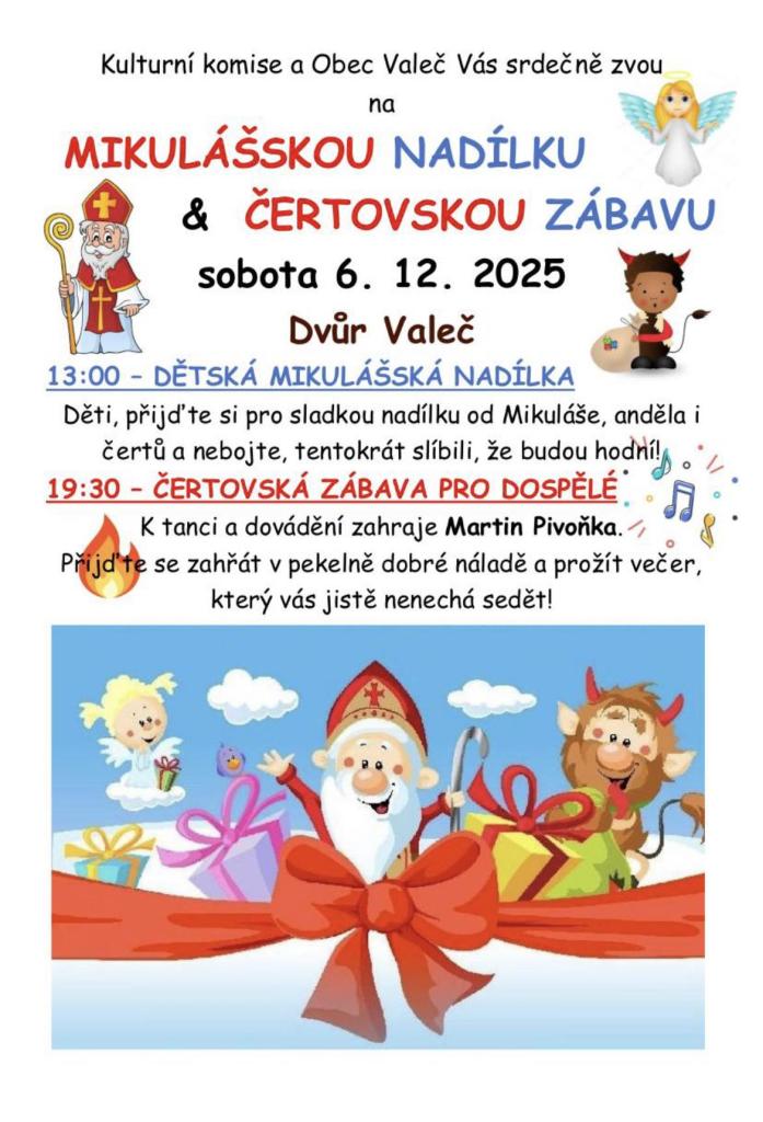Dětská mikulášská nadílka od 13 hod. - děti si přijdou pro sladkou nadílku od Mikuláše, anděla i čertů a nebojte, tentokrát slíbili, že budou hodní